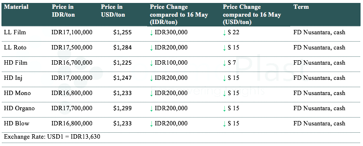 A major producer in Indonesia has implemented IDR200000-300000/t ($15-22/t) reduction for LLDPE and IDR100000-200000/t ($7-15/t) for HDPE offers in local market compared to their previous offers by mid of the month. The latest price levels of the producer are shown in the following table: