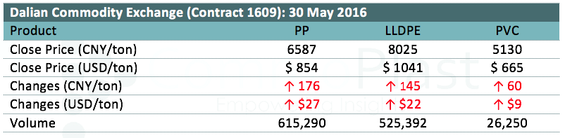 Contract number 1609 on Dalian Commodity Exchange on 30 May 2016 settled as following: