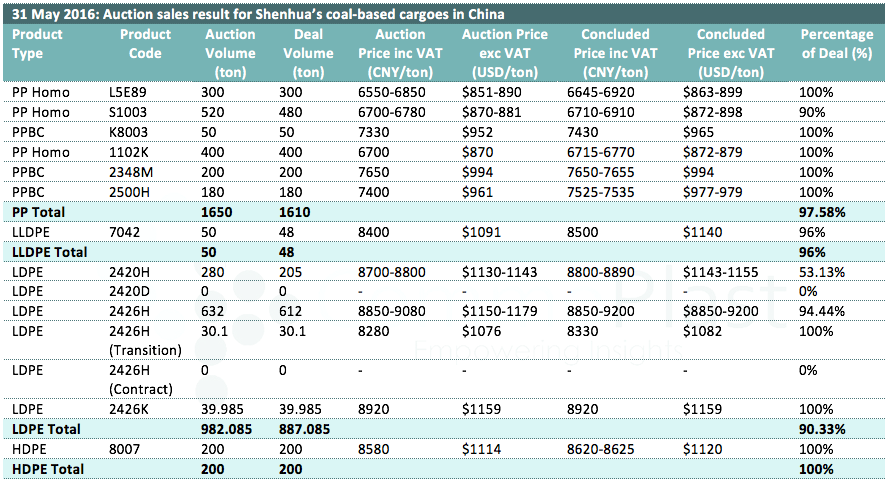 Auctions sales result for Shenhua’s coal-based polyolefin products in domestic China are as following: