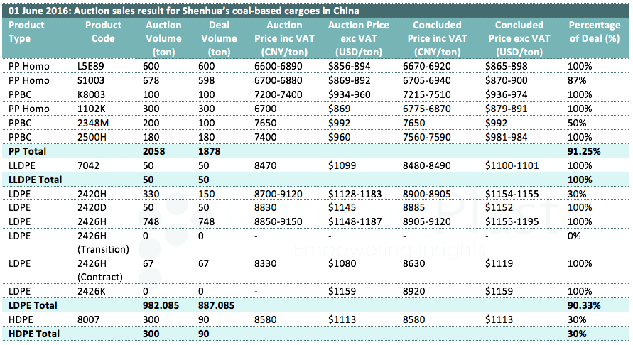 01 June 2016: Auction sales result for Shenhua's coal-based cargoes in China