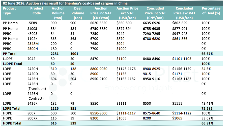 Auctions sales result for Shenhua’s coal-based polyolefin products in domestic China are as following:
