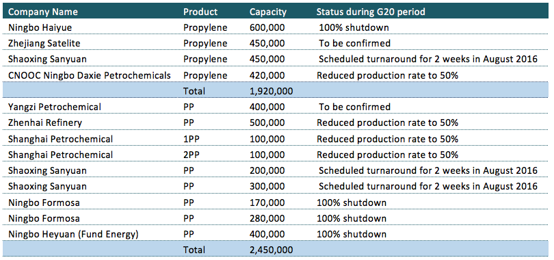 With the measures taking place 14 days, market participants are raising concern over state of PP supply in early September with a trader in Ningbo said, “We expect the producers to ramp up operation rate in the near term to cover the estimated production loss during the G20 Summit. This however, might impact more on futures trading.”