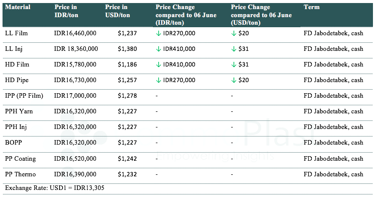 A major maker in Indonesia has announced their new offers for beginning of the week with reduction of IDR270,000-410,000/t ($20-31/t) for LLDPE and HDPE, remaining stable trend for PP offers for domestic market as compared to last week.