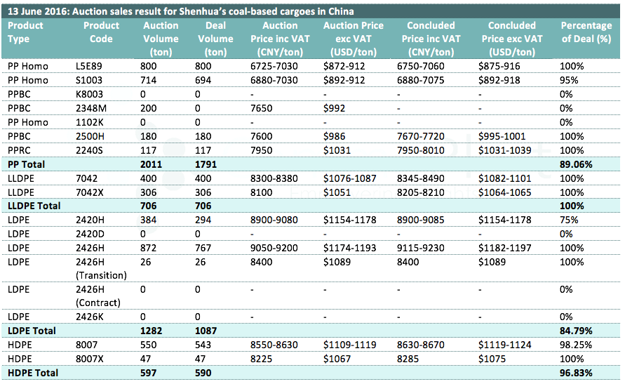 Auctions sales result for Shenhua’s coal-based polyolefin products in domestic China are as following: