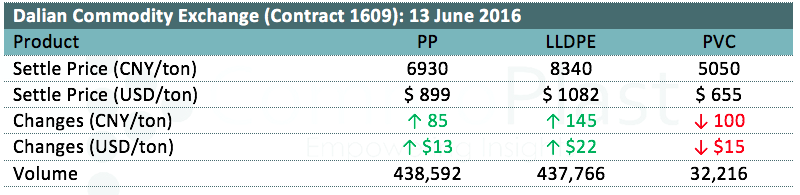 Contract number 1609 on Dalian Commodity Exchange on 13 June 2016 settled as following: