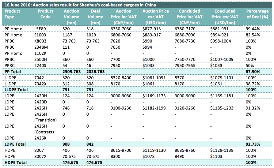 16 June 2016: Auction sales result for Shenhua's coal-based cargoes in China