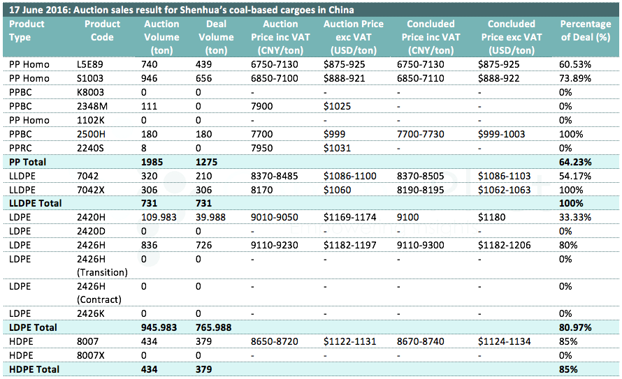 Auctions sales result for Shenhua’s coal-based polyolefin products in domestic China are as following:
