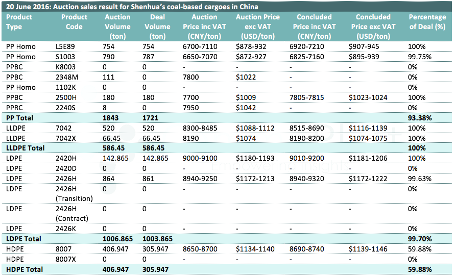 20 June 2016: Auction sales result for Shenhua's coal-based cargoes in China