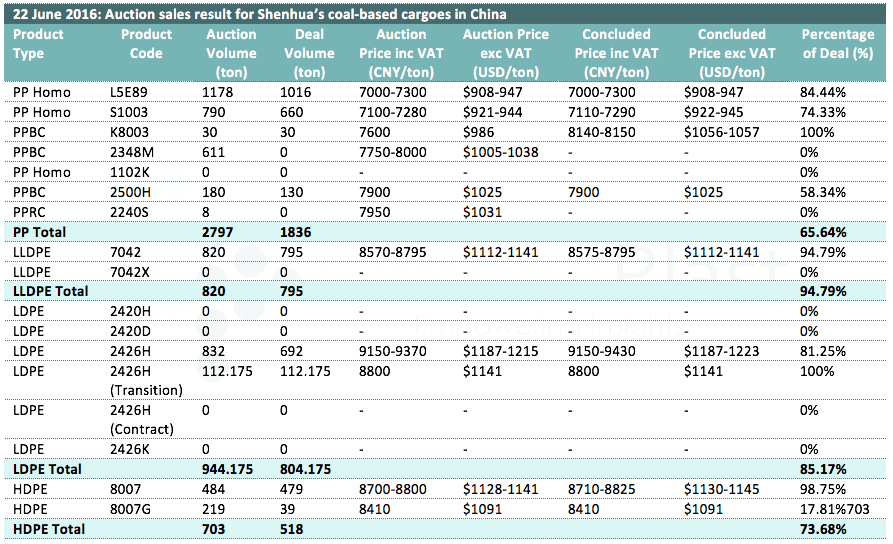 22 June 2016: Auction sales result for Shenhua's coal-based cargoes in China