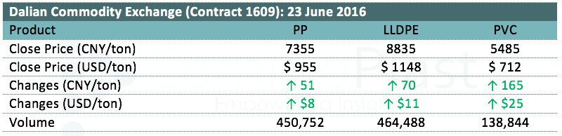 Contract number 1609 on Dalian Commodity Exchange on 23 June 2016 settled as following:
