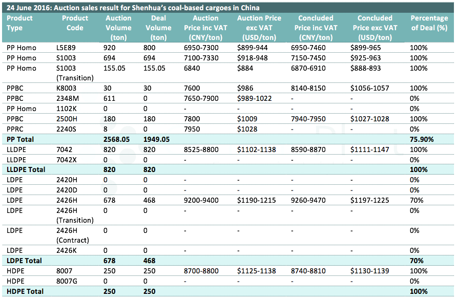 Auctions sales result for Shenhua’s coal-based polyolefin products in domestic China are as following: