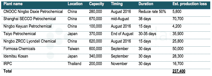 Asian market players are discussing about possible supply tightness for styrene monomer during Q3 as several major plants go off for maintenance work, which might support higher prices. Indeed, the production overhaul peak during end of August and beginning of September, resulted in production loss of approximate 237,400 tons in total.