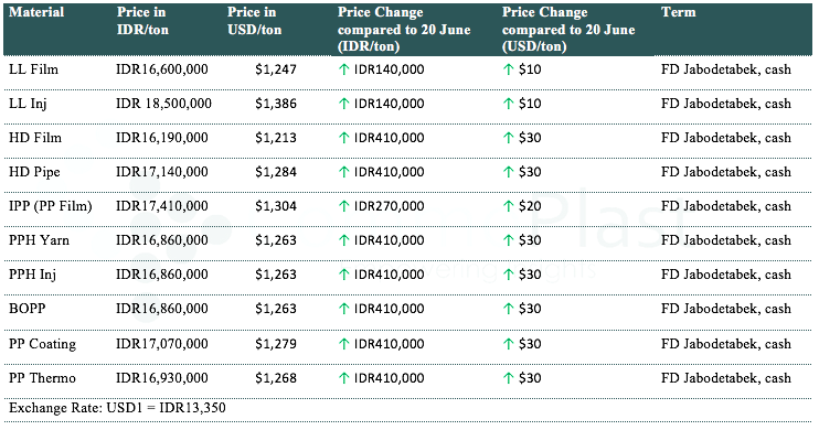 A major maker in Indonesia has announced their offers on beginning of the week with an increased of IDR140,000/t ($10/t) for LLDPE, IDR410,000/t ($30/t) for HDPE and IDR270,000-410,000/t for PP to local market compared to last week.