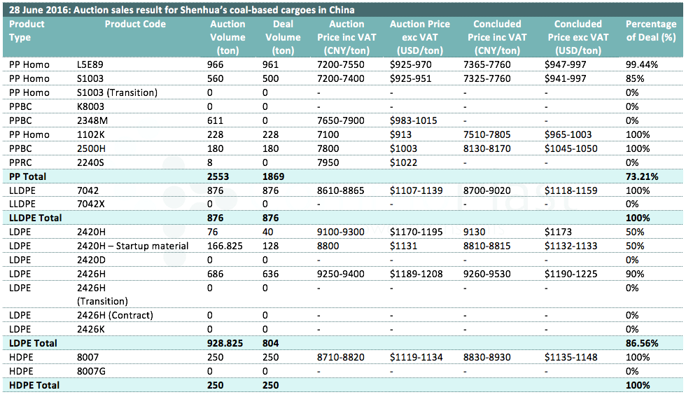 28 June 2016: Auction sales result for Shenhua's coal-based cargoes in China