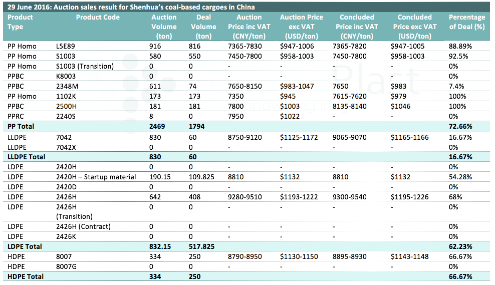 Auctions sales result for Shenhua’s coal-based polyolefin products in domestic China are as following: