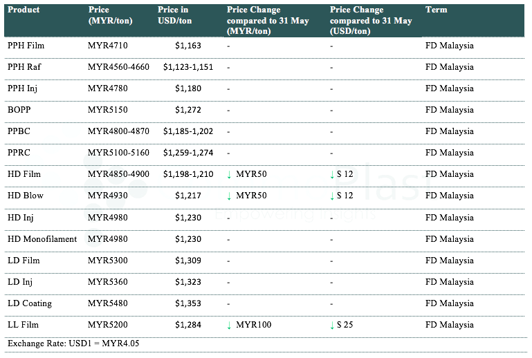 A major Malaysian producer reportedly decreased local offers by MYR100/t ($24/t) for LLDPE, MYR50/t ($12/t) for HDPE film and blow molding, and stable offers for other PE grades and PP compared to last month’s offers. Players attributed the narrower price reduction to the weaker regional currency recently as well as global firmer trend.