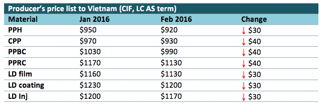 Market players reported that a Southeast Asian producer has announced Feb shipment prices to the region with reduction compared to last month. The producer’s latest price list are reported as following: