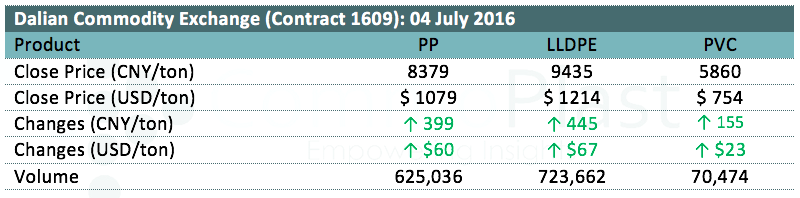 Contract number 1609 on Dalian Commodity Exchange on 04 July 2016 settled as following: