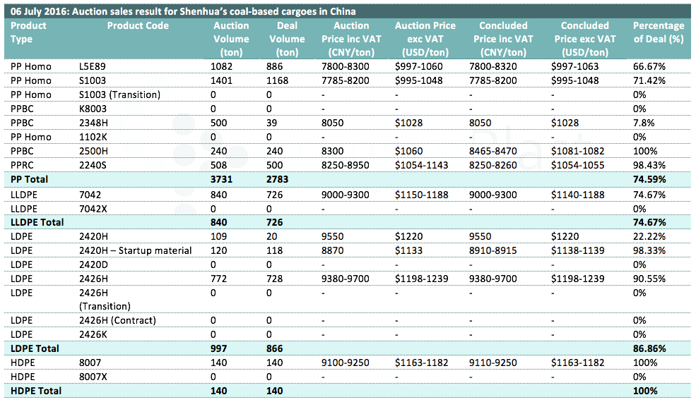 06 July 2016: Auction sales result for Shenhua's coal-based cargoes in China