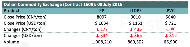 Contract number 1609 on Dalian Commodity Exchange on 08 July 2016 settled as following: