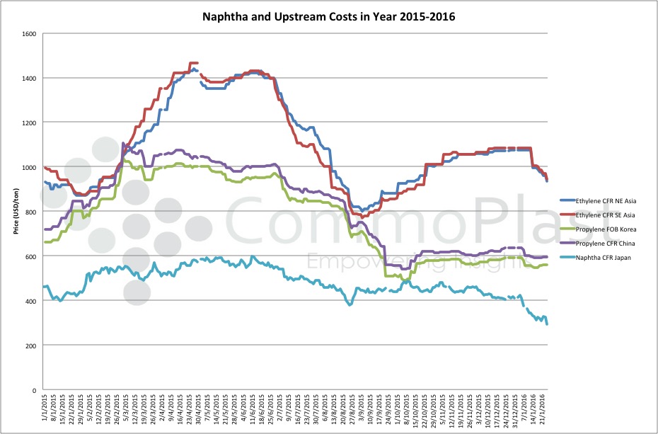 It is reported that on Tuesday (26 Jan 2016) naphtha value has plunged more than $30/t to reach multi-year low at $293/t CFR Japan term. This is believed to be a result of abundant supply condition while demand in Asia has weakened slightly, industries sources said.